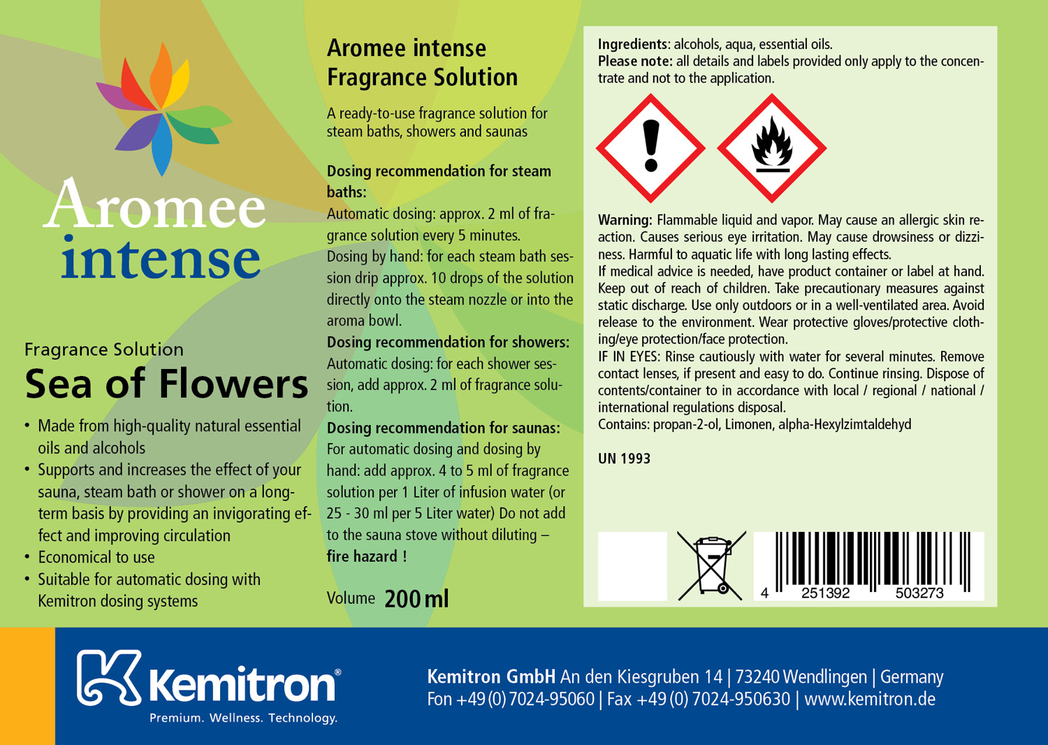 Ready-to-use and economical fragrance solution Sea of Flowers of the highest quality for steam baths, showers and saunas. Good fragrance effect with low consumption.